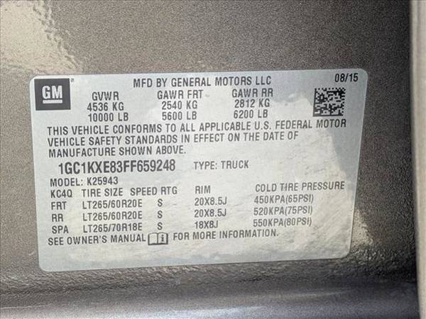 * Duramax Plus Package * Engine; Duramax 6.6L Turbo Diesel V8; B20-Diesel Compatible * Transmission; Allison 1000 6-Speed Automatic; Electronically Controlled * Leather Seats * Navigation System * Led Lighting; Cargo Box With Switch On Center Switch Bank * Rear Axle; 3.73 Ratio * Engine Block Heater * Cooled Front Seat(S) * Chrome Wheels * 2015 Interim Processing Code * Brownstone Metallic * Chevrolet Mylink Audio System; 8" Diagonal Color Touch Navigation With AM/FM/SiriusXM; Usb Ports * Driver Alert Package * Emissions; Federal Requirements * Exhaust Brake * Gvwr; 10;000 Lbs. (4536 Kg) * High Country Preferred Equipment Group * License Plate Kit; Front * Paint; Solid * Pedals; Power-Adjustable * Saddle; Perforated Leather-Appointed Seat Trim * Seats; Front Full-Feature Leather-Appointed Bucket * Steering Wheel; Heated; Leather Wrapped With Audio And Cruise Controls * Suspension Package; Standard * Tires; Lt265/60R20E All-Terrain; Blackwall * Wheel; 18" X 8" (45.7 Cm X 20.3 Cm) Full-Size; Steel Spare * Wheels; 20" (50.8 Cm) Chromed AluminumContact AutoNation Ford Mazda Corpus Christi today for information on dozens of vehicles like this 2015 Chevrolet Silverado 2500HD Built After Aug 14 High Country. This Chevrolet includes: ENGINE, DURAMAX 6.6L TURBO DIESEL V8, B20-DIESEL COMPATIBLE Diesel Fuel 8 Cylinder Engine Turbocharged *Note - For third party subscriptions or services, please contact the dealer for more information.* Indulge yourself with one of the most highly crafted, most luxurious automobiles available today. Where do you want to go today? With 4WD, you can choose to drive virtually anywhere and on terrain 2WD vehicles can't handle. This 2015 Chevrolet Silverado 2500HD Built After Aug 14 has such low mileage it has been parked more than driven. More information about the 2015 Chevrolet Silverado 2500HD Built After Aug 14: The Silverado range is always one of GM's biggest sellers. This means GM is always endeavoring to innovate and continue to improve the truck's design. As a result, the consumer wins -- whether hauling equipment to a job site, working a farm or towing a boat, the Silverado 2500 and 3500 are built for tough work, and they are some of the best-designed trucks available from any manufacturer. Made in either short- or long-bed form, with two- or 4-wheel drive, optional dual rear wheels and with a choice of several impressively powerful engines, the Silverado can be set up do just about anything asked of it. The 2500, even simply configured, is capable of towing a massive load and base prices start around $31,000. This model sets itself apart with powerful engine lineup, Superior heavy-duty towing and hauling capability, wide variety of configurations, available 4-wheel drive, and class-leading design