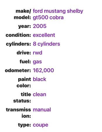 THIS IS NOT A TOY FOR TOTS……….this Mustang purrs like a kitten, but roars like a lion and takes off like a jaguar. It is very fast. You will be thrilled by the performance of this custom cobra GT500 Shelby clone. She runs and drives perfectly no problems extremely reliable. The odometer shows 162,000 miles but there are only 30,000 miles on the new engine and the new five speed racing clutch. It has long tube headers, dual exhaust and was professionally tuned by Bama Mustang professionals in Corpus Christi. It’s rated as a stage 1 car. The under glow lights make the vehicle look calm and mysterious, but when you romp on the pedal, she screams with 410+ HP. Cold AC and no rest. ACT QUICK